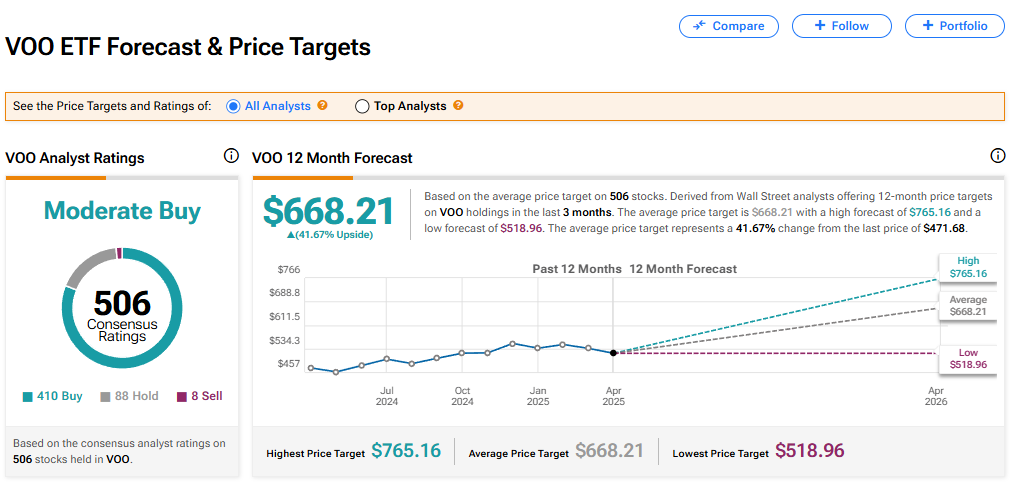 The Vanguard S&P 500 ETF (VOO), which tracks the movements of the benchmark U.S. stock index, has a consensus Moderate Buy rating among 506 Wall Street analysts. That rating is based on 410 Buy, 88 Hold, and eight Sell recommendations made in the last three months. The average VOO price target of $668.21 implies 41.67% upside from current levels.