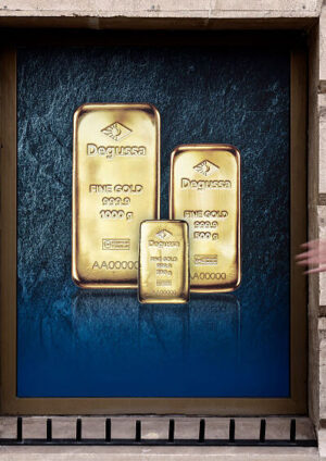 A woman and a man walking past a poster depicting investment gold bars on a gold dealer's window.Gold's rollercoaster year...