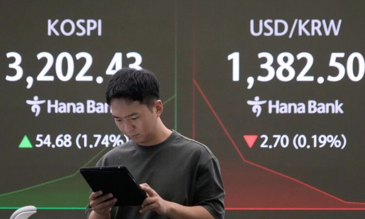 Currency traders watch monitors near a screen showing the Korea Composite Stock Price Index (KOSPI) at the foreign exchange dealing room of the Hana Bank headquarters in Seoul, South Korea, Tuesday, Aug. 5, 2025. Credit: AP/Ahn Young-joon