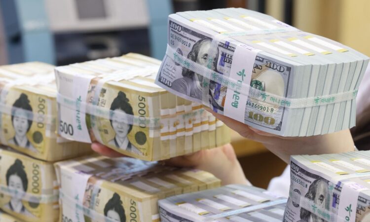 An official checks U.S. dollar notes at a bank branch of Hana Bank in central Seoul, April 3. Yonhap