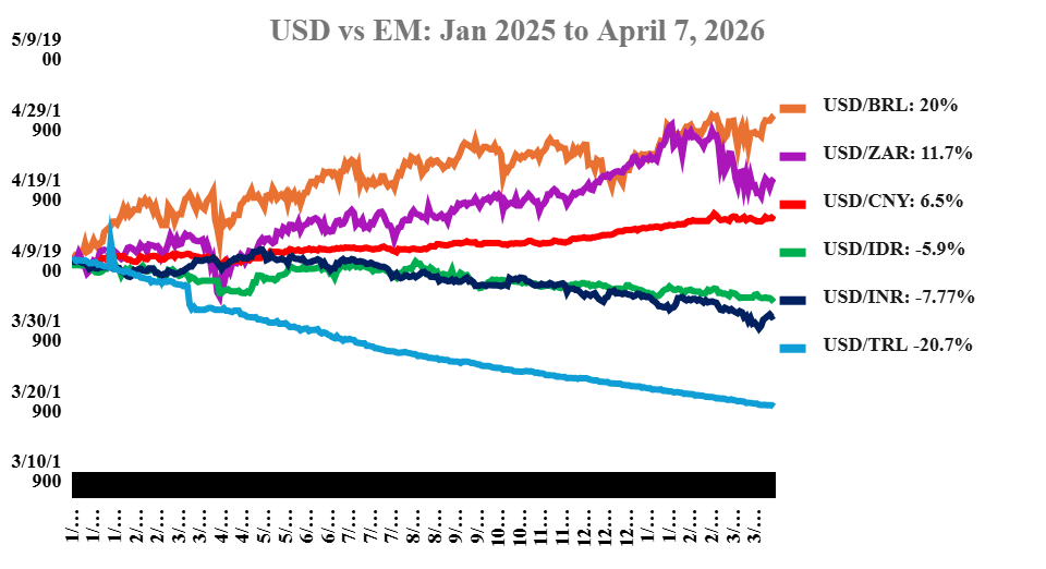 (Source: Refinitiv DataStream, Data from Jan 2025 till April 7 2026, All currencies shown against US Dollar, rebased to 100, readings below 100 denote that the currency has depreciated against the US Dollar)