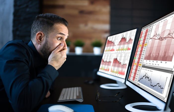 A person with their hand over their mouth looks at charts on a pair of computer screens.