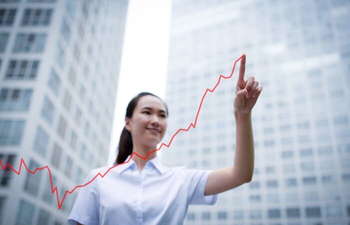An investor traces a line upward in the air while standing outside in a city.