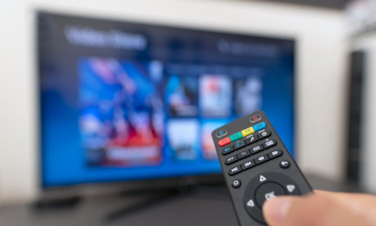 A remote in front of a smart TV.