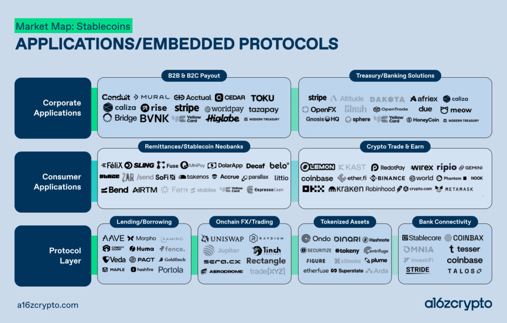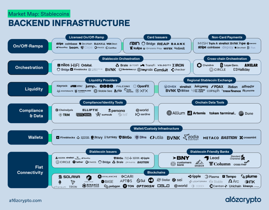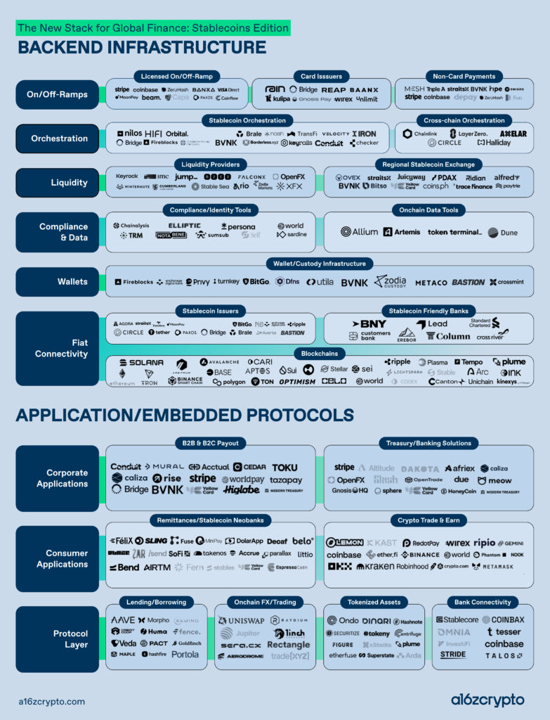 Stablecoins are a catalyst. They have evolved from a niche trading instrument into foundational plumbing, and they are becoming the layer on which a new generation of global financial products gets built. The market map accompanying this post captures our view of the transformation that’s underway. The specific companies are likely to change, and the categories will likely blur and evolve — but the more important story is structural: How the new stack for global finance is coming together, where it’s maturing, and what gaps remain.