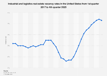Colliers International. (January 22, 2026). Industrial and logistics real estate vacancy rates in the United States from 1st quarter 2017 to 4th quarter 2025 [Graph]. In Statista. Retrieved April 20, 2026, from https://www.statista.com/statistics/194081/us-industrial-vacancy-rate-forecasts-from-2010/?__sso_cookie_checker=failed